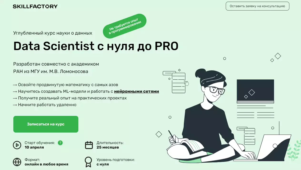 • Высоковата цена и большая длительность – 2 года, зато вас подготовят к работе с любыми типами и массивами данных, при этом сможете зарабатывать ещё до получения сертификата.