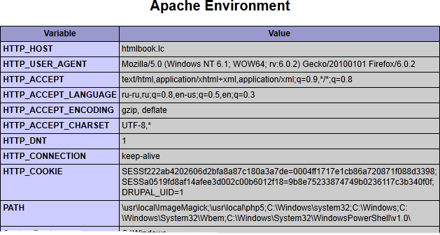 Также можно написать программу на PHP, которая будет выводить все переменные окружения в виде таблицы (пример 3)..